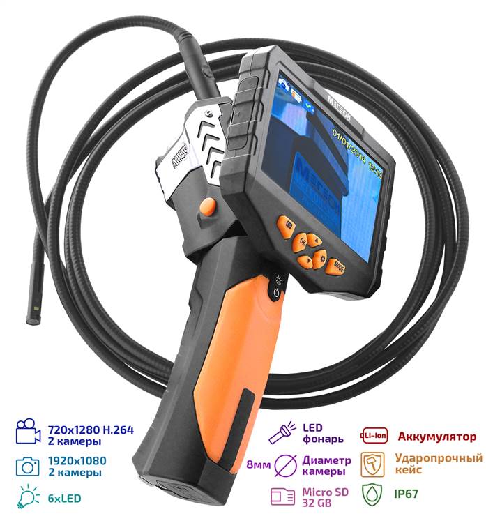 МЕГЕОН 33500- 38D - новинка в модельном ряду цифровых видеоскопов, предназначенный для решения задач в быту и промышленности. Эндоскоп представляет собой устройство для исследования и осмотра скрытых от глаза полостей с возможностью сохранения видеоизображения со звуком на встроенный носитель SDHC 32Гб. Помимо этого предусмотрено получение цветных изображений с помощью фотографий. Зонд диаметром 6,9 мм и длиной 3 метра имеет полужёсткую конструкцию на конце которого поместились две перпендикулярно направленные камеры. Подсветки оснащены яркими светодиодами со ступенчатой регулировкой яркости, которые обеспечивают работу в условиях полного отсутствия освещения. Большой ЖК-дисплей с разрешением 854 х 480 и диагональю 4,3' отчётливо отобразит всё происходящее перед объективом. Дополнительно в корпусе предусмотрена подсветка с высокой интенсивности свечения, которая с лёгкостью заменит фонарик. Преимущества изделия по достоинству смогут оценить профессионалы и любители.